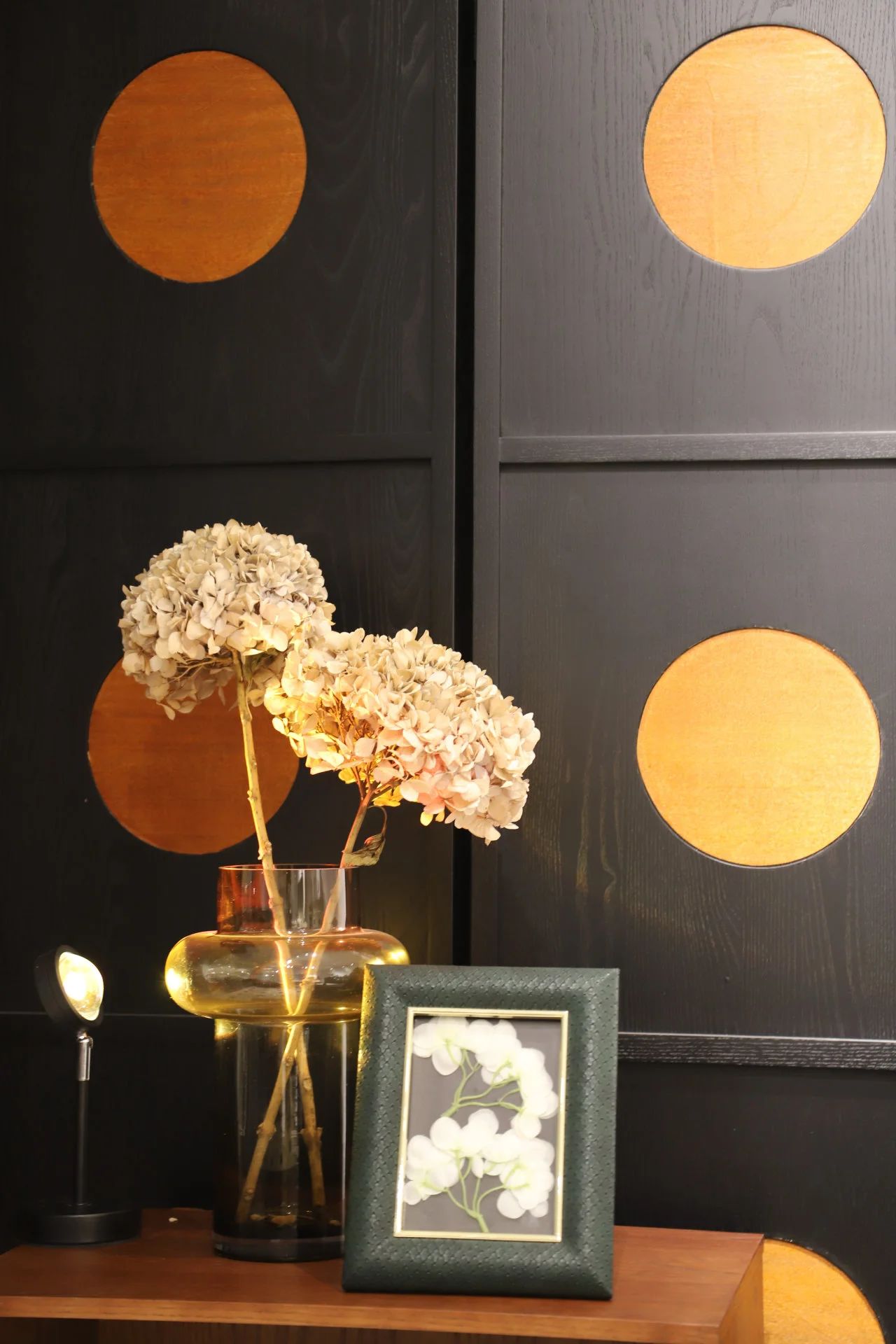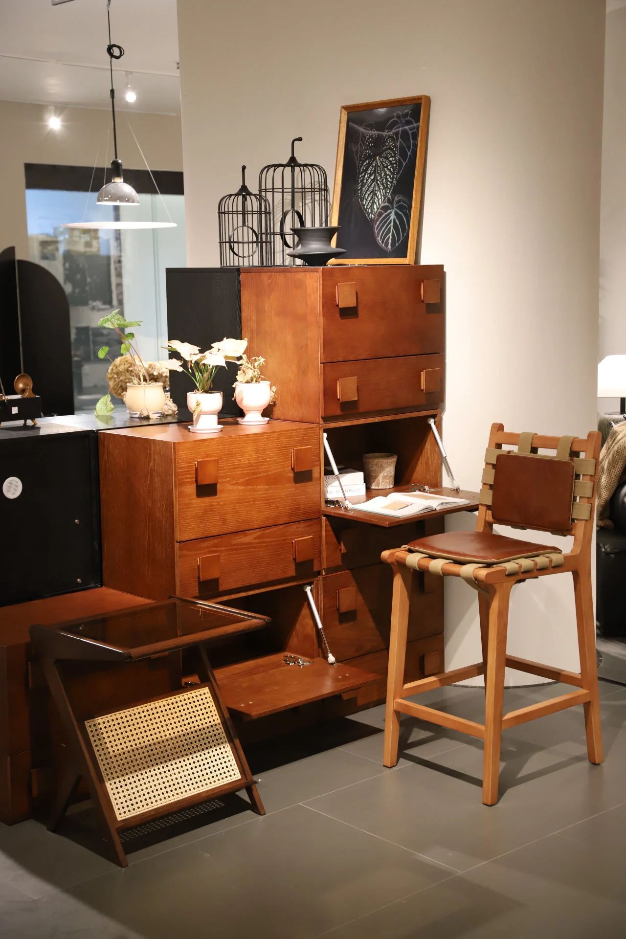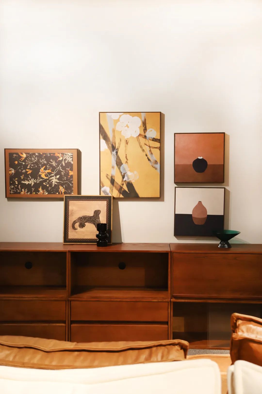 Based on neutral colours and orange-toned wood colours, home accessories can choose black, red, green, blue, etc. as a clash of colours accents, to enhance the sense of vintage visually.