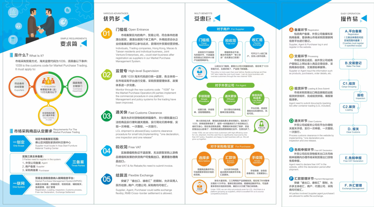 The mode of market purchase trade refers to the mode of trade in which commodities are purchased in the recognized market agglomeration area with the maximum value of a single customs declaration of US $150,000, and the qualified operator go through the export clearance formalities at the local customs office where the commodities are purchased. This trading method is designed for professional markets with "miscellaneous goods, multiple batches, small quantities" export trade, offering simple declarations, fast customs clearance, and flexible multi-party collection of foreign exchange, effectively solving the difficulties faced by small and medium-sized enterprises (SMEs) in exporting through general trading methods.